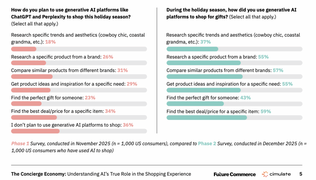 About the survey: We worked with Future Commerce on a 2-part survey. First, we surveyed 1,000 consumers to understand their awareness & current usage of Gen AI platforms, and intent to leverage for holiday 2025 shopping. Second, we surveyed 1,000 Gen AI users to understand what they actually leveraged AI platforms for, and what it meant for their shopping behaviors moving forward.